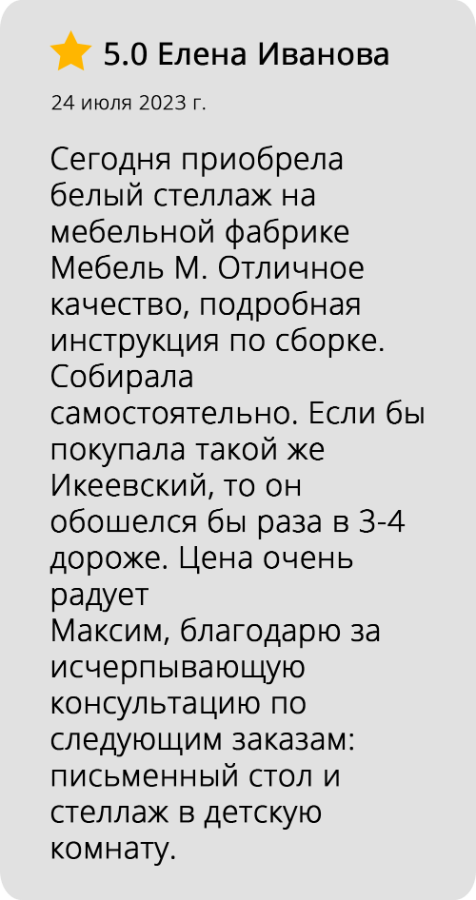 Отзывы довольных клиентов о Мебель М: Интересует мебель? Свяжитесь с нами! Ваше имя Контактный телефон Отправить Качество, которому доверяют: сотни положительных отзывов на известных торговых площадках. Это результат нашей работы и признание клиентов.