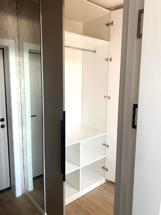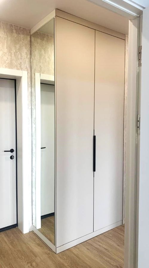 Для маленьких коридоров. Выбирайте узкий угловой шкаф или модель‑купе с вертикальным зеркалом — это минимизирует «забитость» пространства.