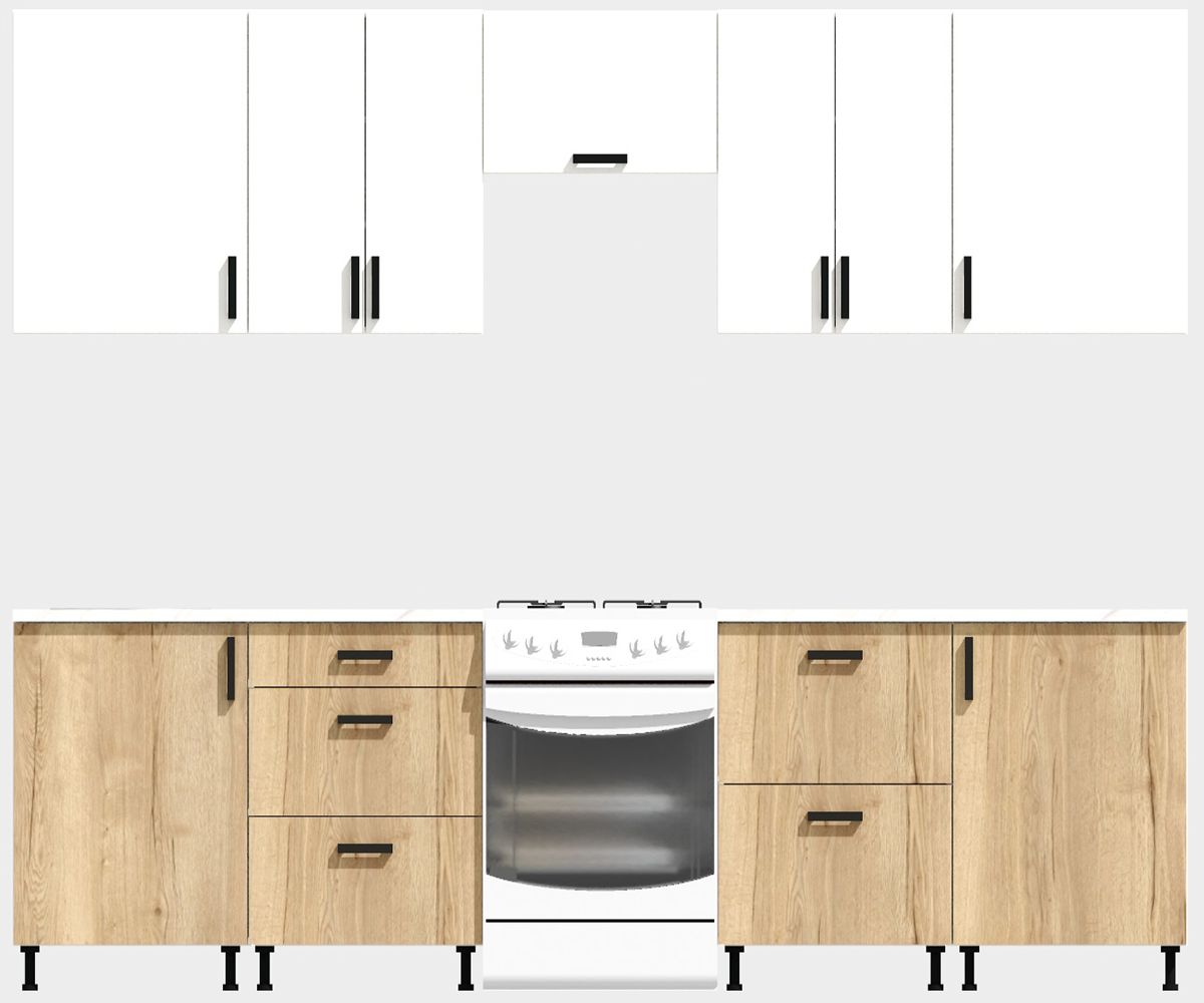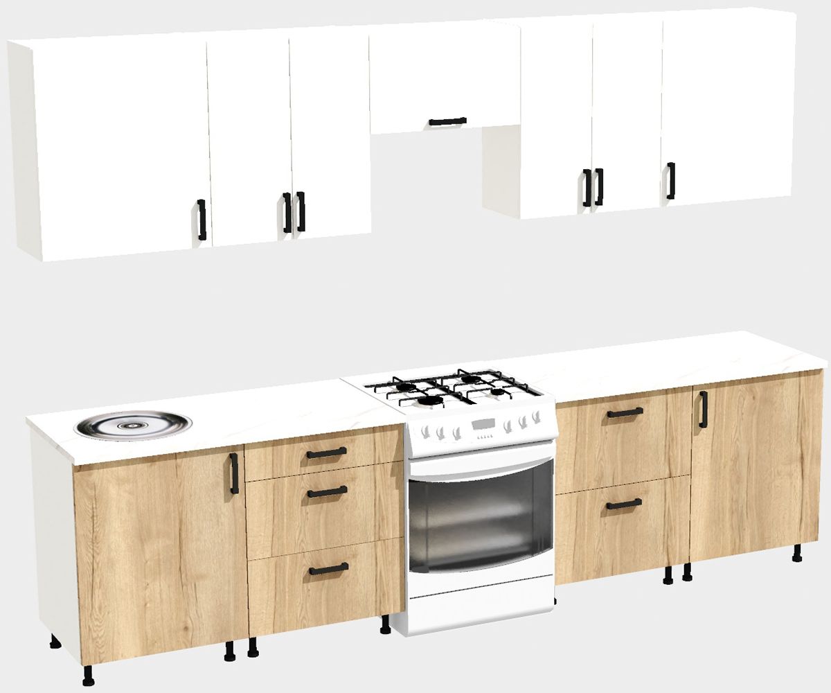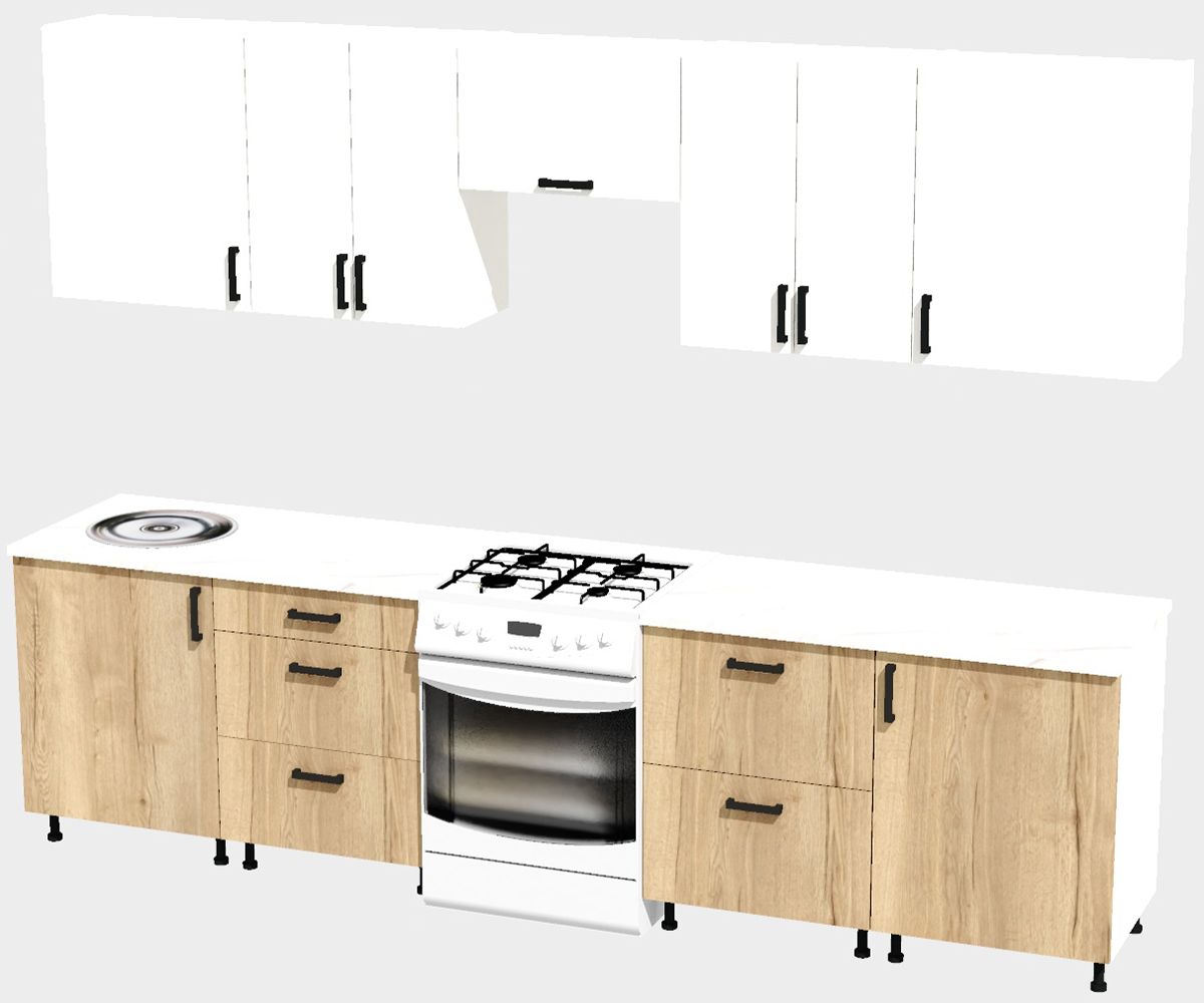 КорпусЛДСП 16 мм. Цвет БелыйФасадыЛДСПЦвет верхних фасадовБелыйЦвет нижних фасадовДуб ВотанРучкиЧерныеТолщина столешницы26 мм.ПетлиБез доводчиковНаправляющие ящиковШариковые без доводчиковЦвет столешницыБелый камень