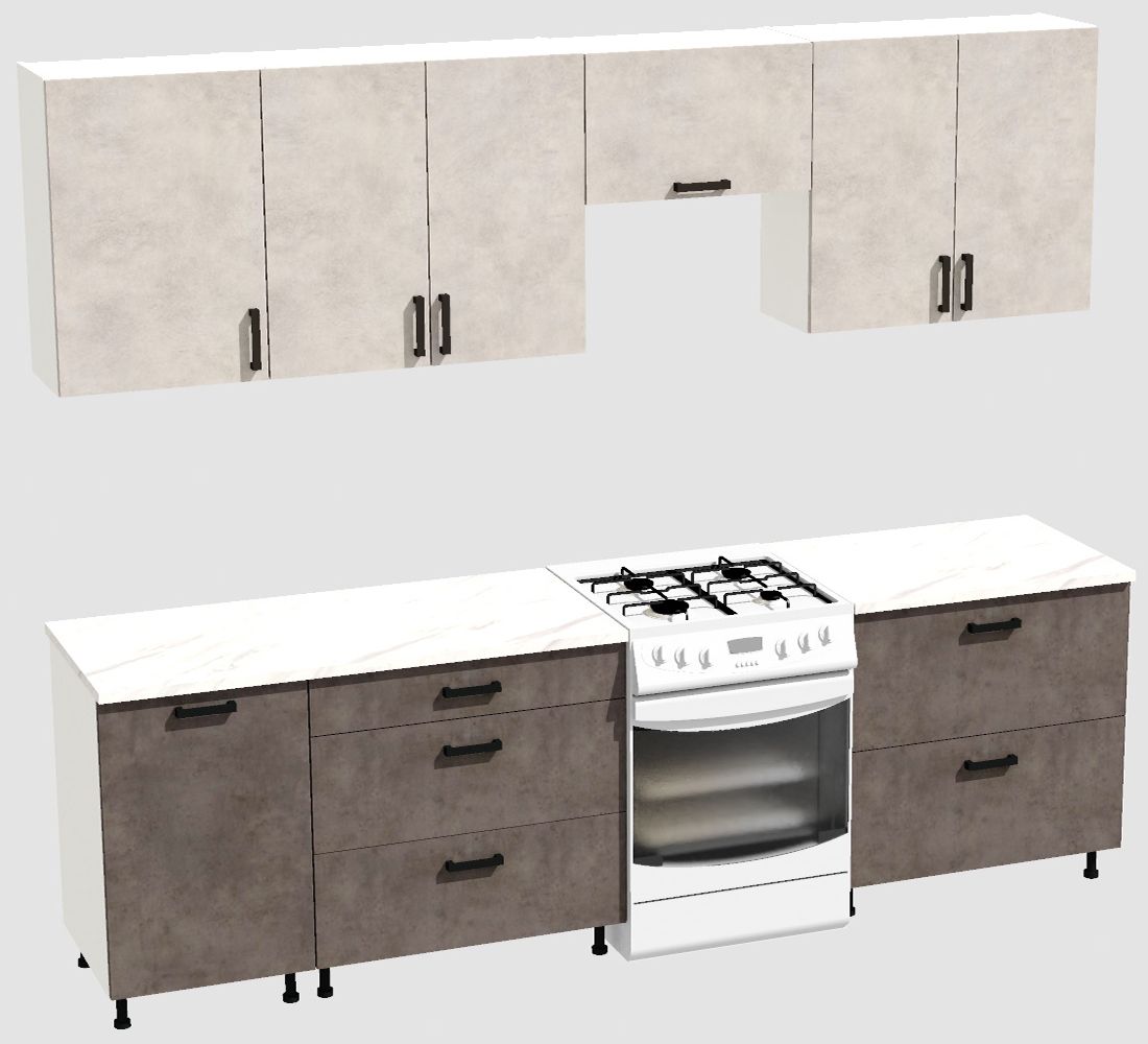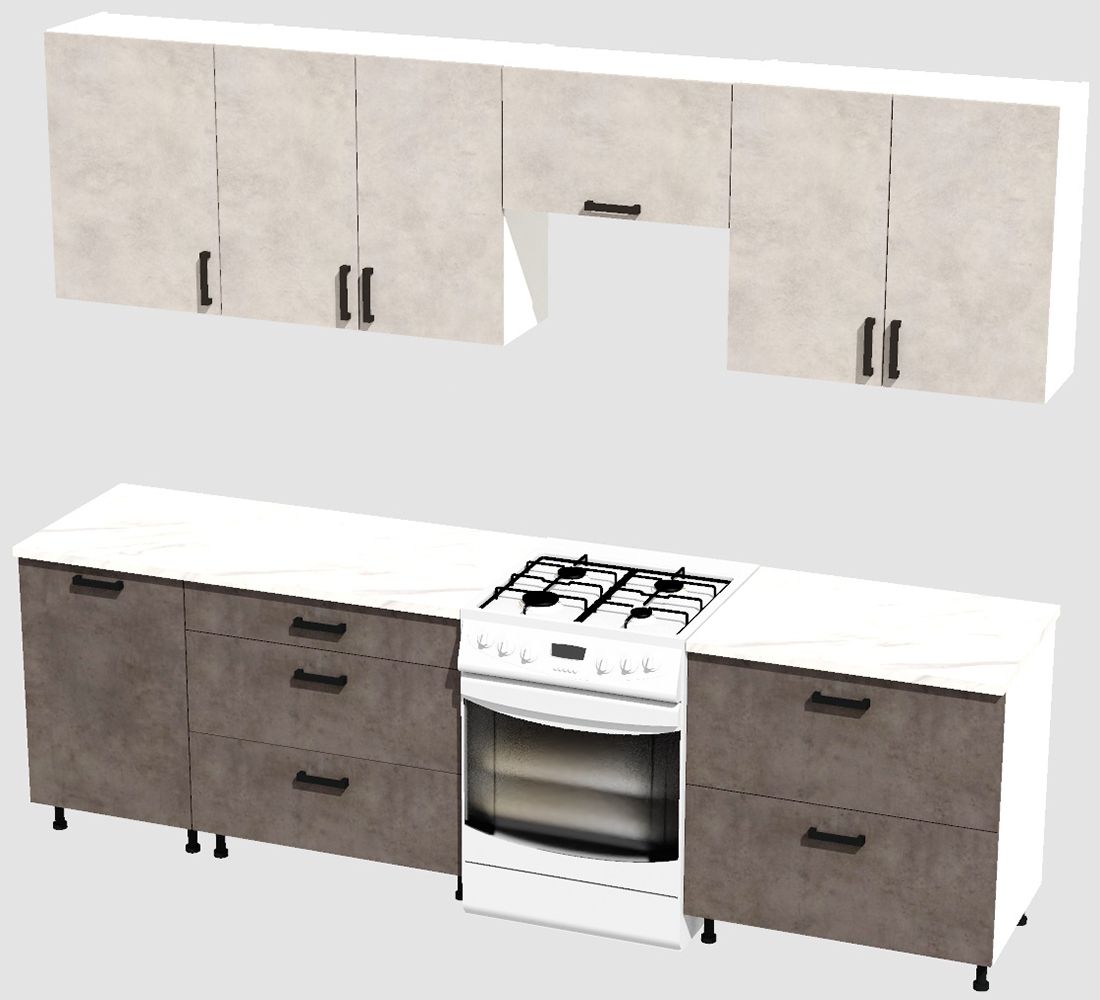 КорпусЛДСП 16 мм. Цвет БелыйФасадыЛДСПЦвет верхних фасадовЦемент светлыйЦвет нижних фасадовЦемент темныйРучкиЧерныеТолщина столешницы26 мм.ПетлиБез доводчиковНаправляющие ящиковШариковые без доводчиковЦвет столешницыБелый камень