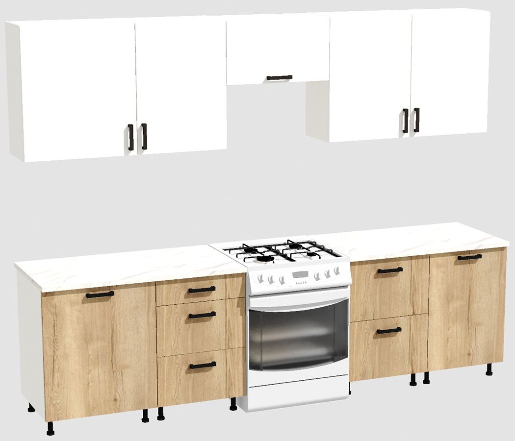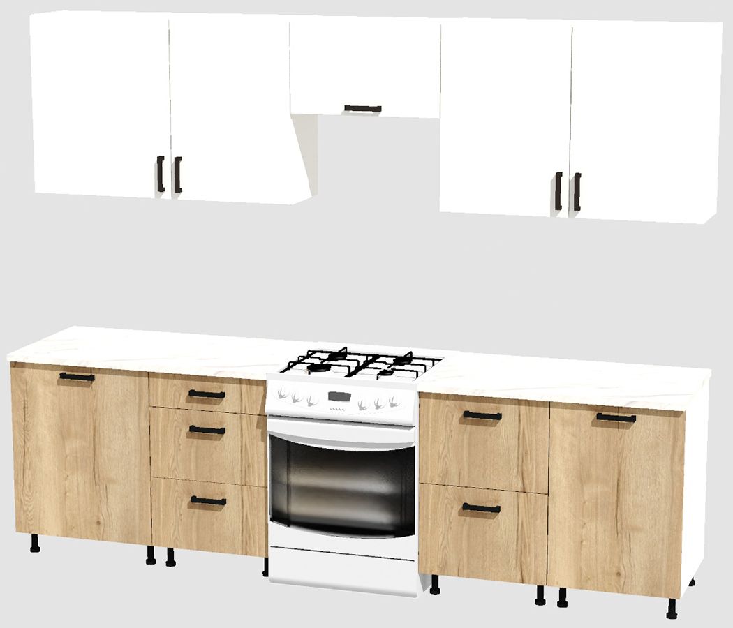 КорпусЛДСП 16 мм. Цвет БелыйФасадыЛДСПЦвет верхних фасадовБелыйЦвет нижних фасадовДуб ВотанРучкиЧерныеТолщина столешницы26 мм.ПетлиБез доводчиковНаправляющие ящиковШариковые без доводчиковЦвет столешницыБелый камень