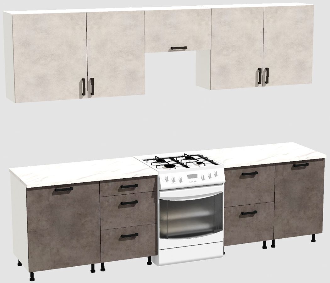 КорпусЛДСП 16 мм. Цвет БелыйФасадыЛДСПЦвет верхних фасадовЦемент светлыйЦвет нижних фасадовЦемент темныйРучкиЧерныеТолщина столешницы26 мм.ПетлиБез доводчиковНаправляющие ящиковШариковые без доводчиковЦвет столешницыБелый камень