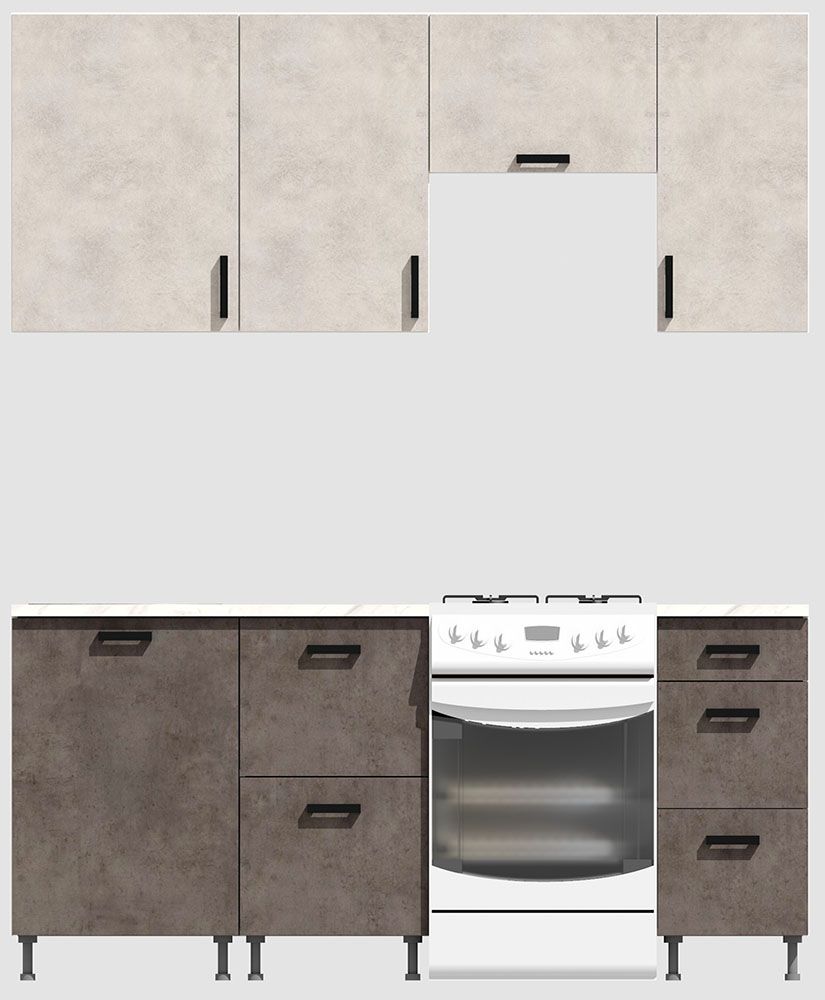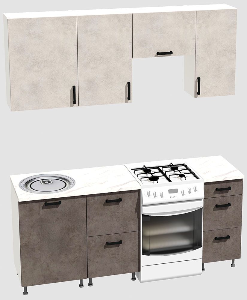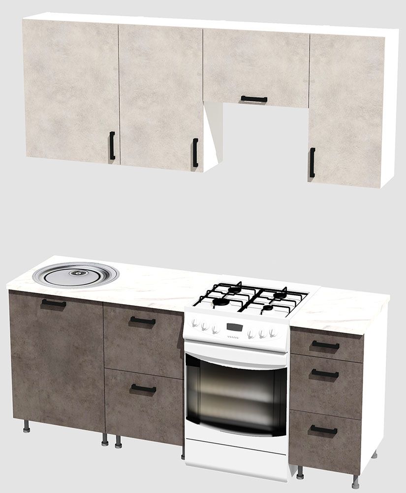 КорпусЛДСП 16 мм. Цвет БелыйФасадыЛДСПЦвет верхних фасадовЦемент светлыйЦвет нижних фасадовЦемент темныйРучкиЧерныеТолщина столешницы26 мм.ПетлиБез доводчиковНаправляющие ящиковШариковые без доводчиковЦвет столешницыБелый камень