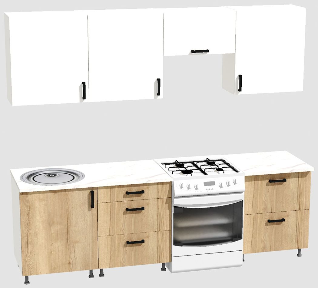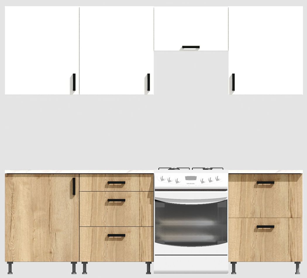КорпусЛДСП 16 мм. Цвет БелыйФасадыЛДСПЦвет верхних фасадовБелыйЦвет нижних фасадовДуб ВотанРучкиЧерныеТолщина столешницы26 мм.ПетлиБез доводчиковНаправляющие ящиковШариковые без доводчиковЦвет столешницыБелый камень