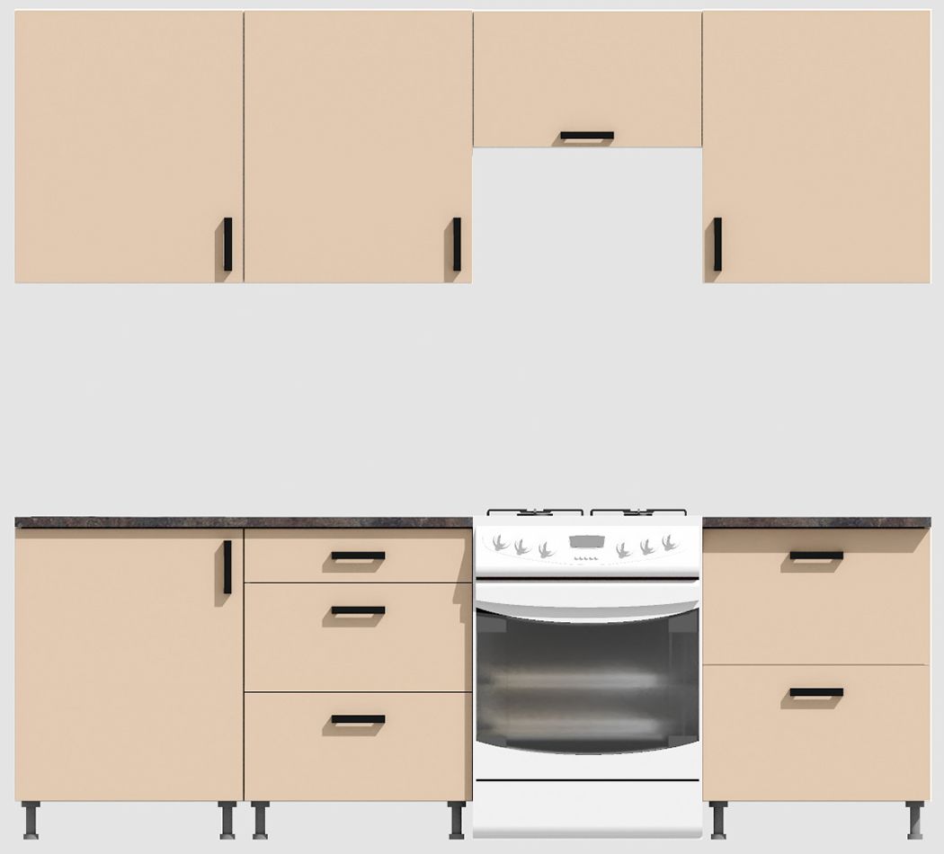 КорпусЛДСП 16 мм. Цвет БелыйФасадыЛДСПЦвет верхних фасадовФон бежевыйЦвет нижних фасадовФон бежевыйРучкиЧерныеТолщина столешницы26 мм.ПетлиБез доводчиковНаправляющие ящиковШариковые без доводчиковЦвет столешницыСерый камень