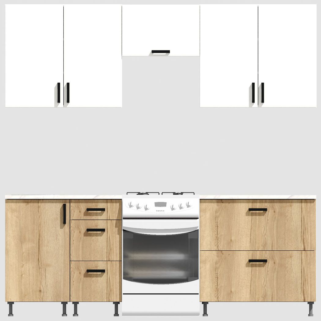 КорпусЛДСП 16 мм. Цвет БелыйФасадыЛДСПЦвет верхних фасадовБелыйЦвет нижних фасадовДуб ВотанРучкиЧерныеТолщина столешницы26 мм.ПетлиБез доводчиковНаправляющие ящиковШариковые без доводчиковЦвет столешницыБелый камень