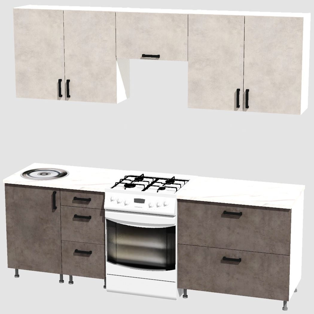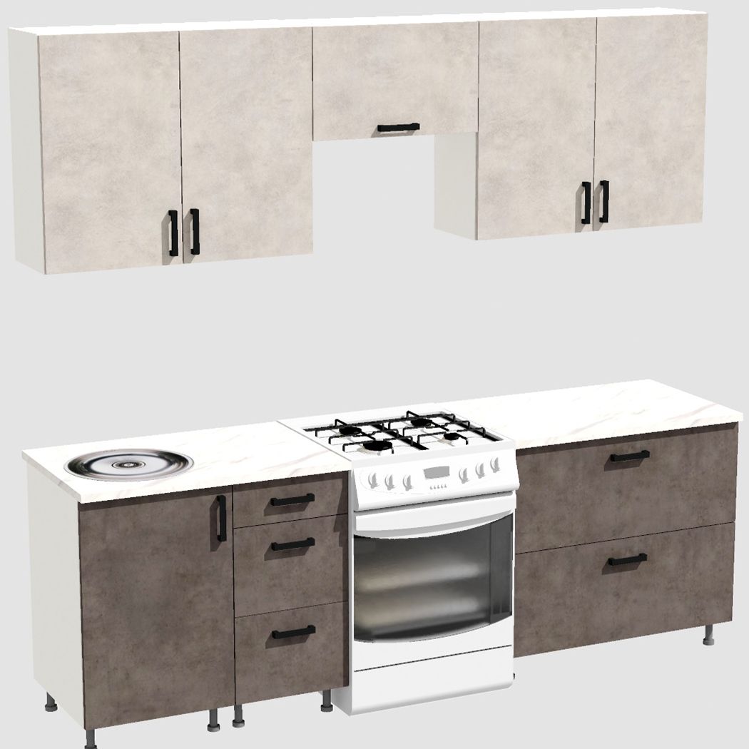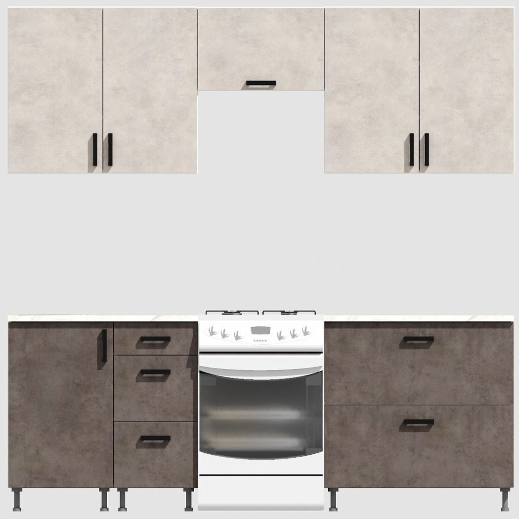 КорпусЛДСП 16 мм. Цвет БелыйФасадыЛДСПЦвет верхних фасадовЦемент светлыйЦвет нижних фасадовЦемент темныйРучкиЧерныеТолщина столешницы26 мм.ПетлиБез доводчиковНаправляющие ящиковШариковые без доводчиковЦвет столешницыБелый камень